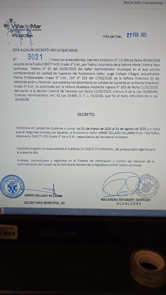 Un oficio de la Contraloría Regional de Valparaíso ha ordenado a la Municipalidad de Viña del Mar a nombrar a un secretario municipal titular en un plazo de quince días hábiles. Esta instrucción se emite luego de que el ente contralor desestimara la solicitud de ascenso de Jorge Cafena Garfe, un funcionario que aspiraba a ocupar ese mismo puesto.